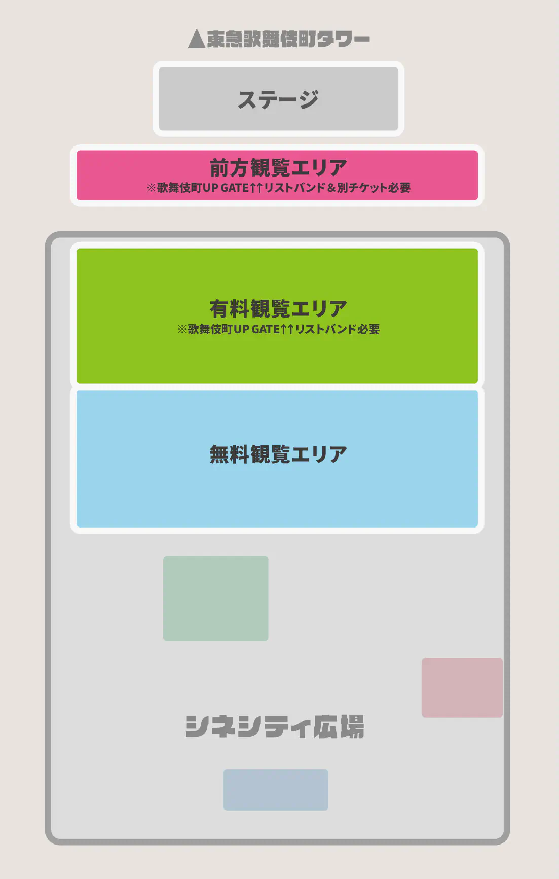- 歌舞伎町タワーステージの観覧は無料です。ただし混雑緩和のため前方観覧エリアは出演アーティストごとに入場券を販売いたします。